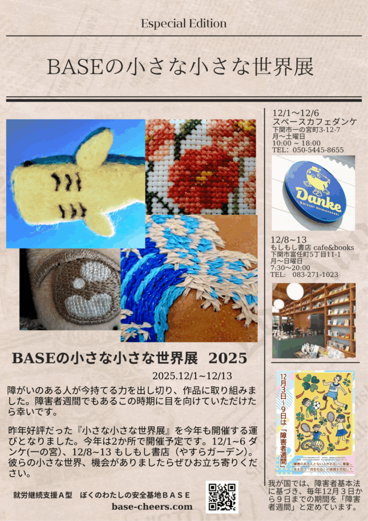 今年も利用者さんの渾身の作品たちの展示『BASEの小さな小さな世界展』を開催します。